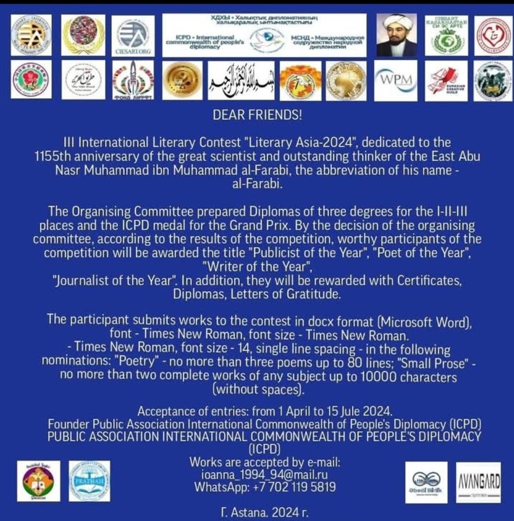 Поздравляем победителей нашего конкурса “Литературная Азия-2024” посвященного предстоящему 1155-летию Аль-Фараби, (2025г.) и Дружбе народов, по Греции.