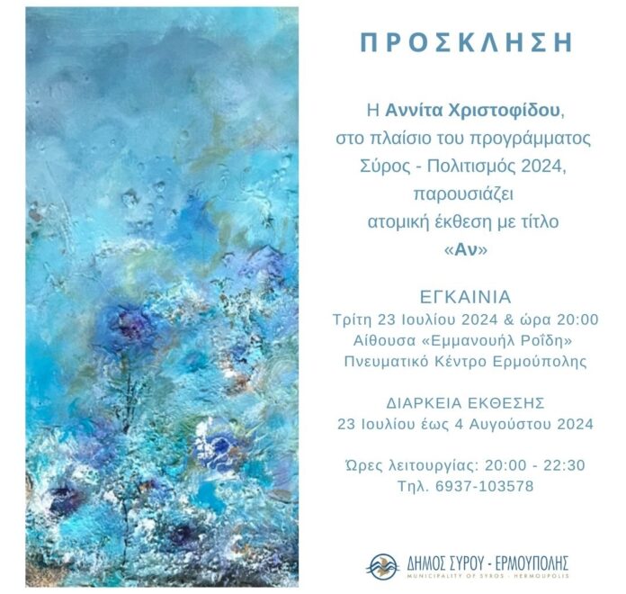 Η έκθεση θα πραγματοποιηθεί στο πλαίσιο του προγράμματος Σύρος – Πολιτισμός 2024 και θα διαρκέσει από τις 23 Ιουλίου μέχρι και τις 4 Αυγούστου 2024.