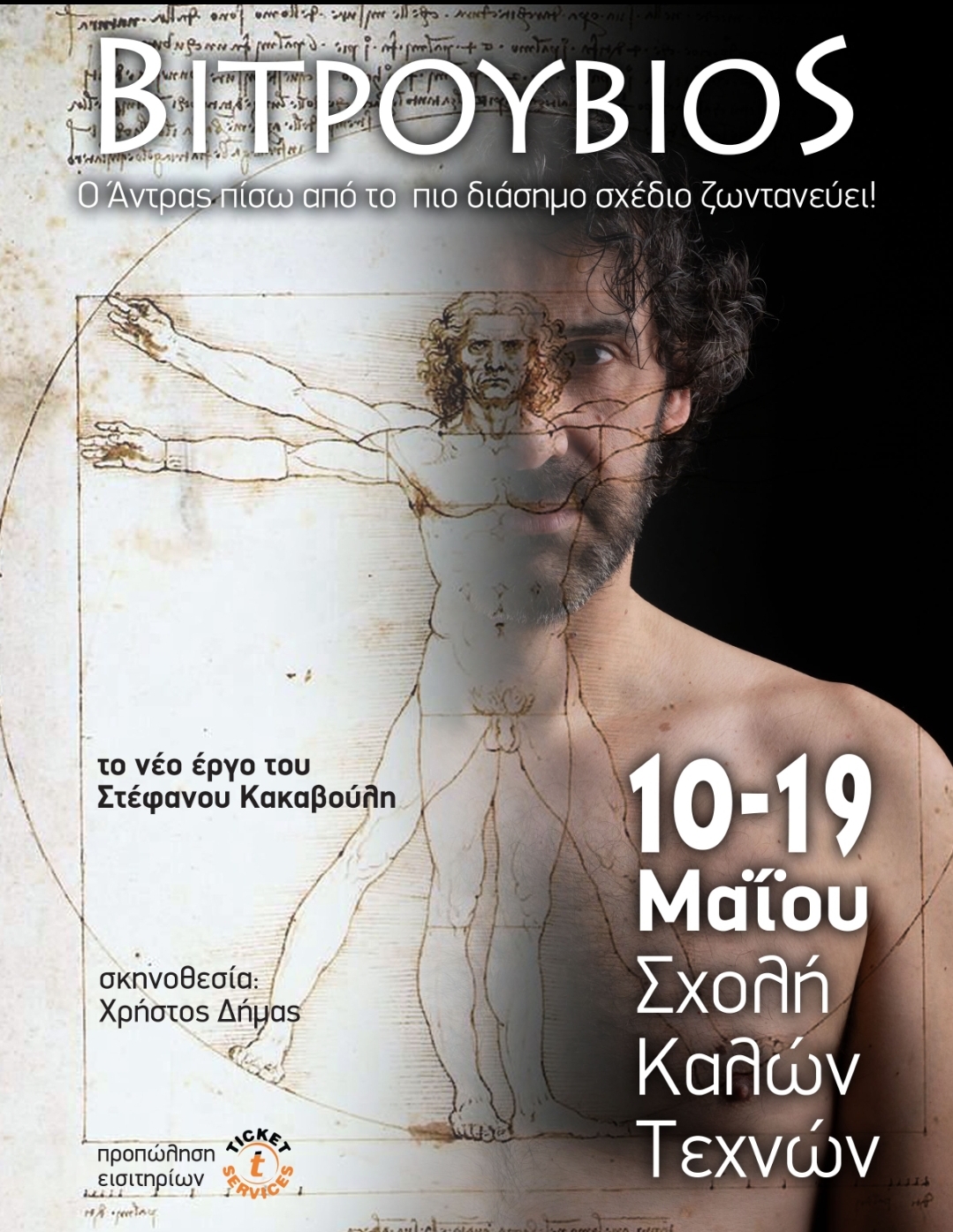 Στις 10 Μαΐου ανεβαίνει στο θέατρο της Ανωτάτης Σχολής Καλών Τεχνών η νέα παράσταση του Στέφανου Κακαβούλη, ο οποίος ερμηνεύει και υπογράφει και το πρωτότυπο θεατρικό κείμενο (το 13ο δικό του κείμενο που παρουσιάζει επί σκηνής), παίρνοντας έμπνευση από το διάσημο έργο του Leonardo Da Vinci, ο Άνθρωπος του Βιτρούβιου.