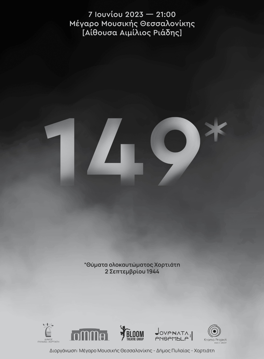 ΤΟ ΧΟΡΕΥΤΙΚΟ ΔΡΑΜΑ «149», έναν αριθμό που φέρει ποιητικούς, συναισθηματικούς, αλλά και ιστορικούς συνειρμούς, καθώς αναφέρεται στον αριθμό των θυμάτων του Ολοκαυτώματος του Χορτιάτη, παρουσιάζουν την Τετάρτη 7 Ιουνίου, στις 9.00 το βράδυ (αίθουσα Αιμίλιος Ριάδης Μ2) ο Οργανισμός Μεγάρου Μουσικής Θεσσαλονίκης και ο δήμος Πυλαίας Χορτιάτη.
