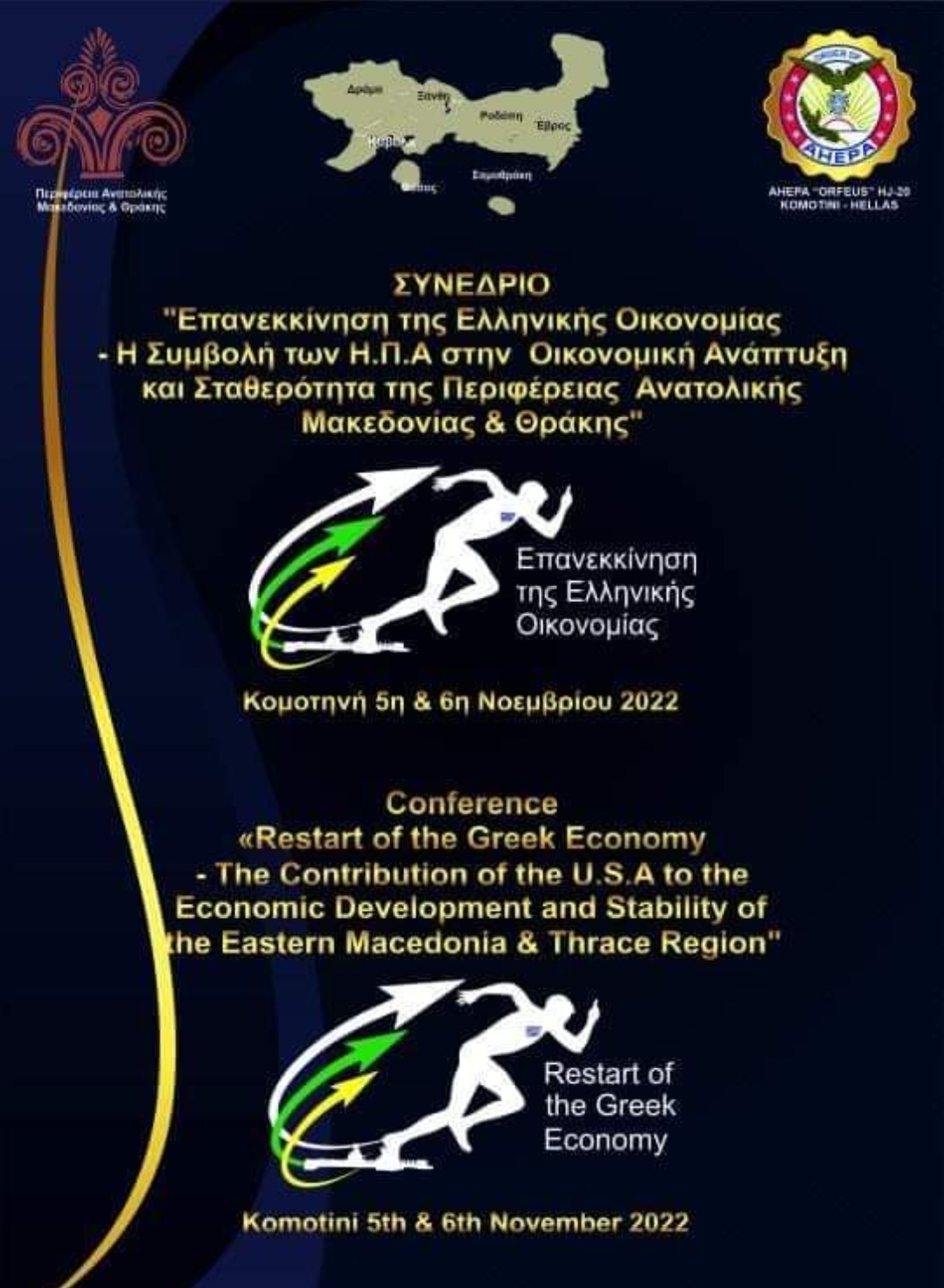 Η “Διεθνής Πρωτοβουλία για την Επανεκκίνηση της Ελληνικής Οικονομίας”, η Περιφέρεια Ανατολικής Μακεδονίας Θράκης και η AHEPA HJ20 – Κομοτηνή, διοργανώνουν Ημερίδα στις 5 Νοεμβρίου 2022 στο Μέγαρο Μουσικής Κομοτηνής, με θέμα: “Επανεκκίνηση της Ελληνικής Οικονομίας – Η Συνδρομή των Η.Π.Α. στην Οικονομική Ανάπτυξη και Σταθερότητα της Περιφέρειας Ανατολικής Μακεδονίας & Θράκης”.