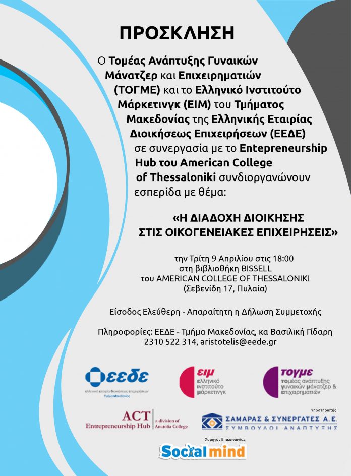 Η επιτυχημένη διαδοχή στη διοίκηση μπορεί να επιτευχθεί με τον στρατηγικό συνδυασμό του οικογενειακού και επιχειρηματικού κύκλου ζωής, ενώ παράλληλα διαφυλάσσονται οι ανάγκες των επόμενων γενεών. Το μέλλον κάθε οικογενειακής επιχείρησης βασίζεται στη δημιουργία υπεύθυνων ιδιοκτητών και στην καλά προετοιμασμένη διαδοχή. Σε αυτό το πλαίσιο o Τομέας Ανάπτυξης Γυναικών Μάνατζερ & Επιχειρηματιών (ΤΟΓΜΕ) και το Ελληνικό Ινστιτούτο Μάρκετινγκ (EIM) του Τμήματος Μακεδονίας της Ελληνικής Εταιρίας Διοικήσεως Επιχειρήσεων (ΕΕΔΕ) σε συνεργασία με το Κέντρο Επιχειρηματικότητας του ACT – The American College of Thessaloniki, διοργανώνουν στη Θεσσαλονίκη, στις 9 Απριλίου 2019 και ώρα 18:00, μία Εσπερίδα σχετικά με τη Διαδοχή στις Οικογενειακές Επιχειρήσεις, στη Bιβλιοθήκης Bissell του κολλεγίου.