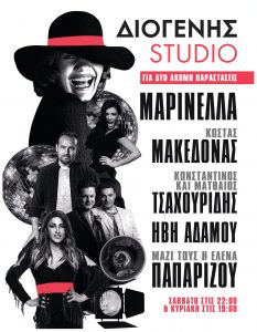 Συνεχίζεται η επέλαση των επωνύμων στο ΔΙΟΓΕΝΗΣ studio προκειμένου να χειροκροτήσουν την Μεγάλη Κυρία του ελληνικού τραγουδιού Μαρινέλλα, στην καλύτερη κατά κοινή ομολογία στιγμή της καριέρας της και να απολαύσουν μαζί της, τον Κώστα Μακεδόνα, τους Αδελφούς Τσαχουρίδη, την Ήβη Αδάμου