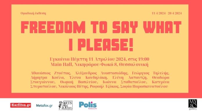 Η Myro Gallery ανακοινώνει την Ομαδική έκθεση Freedom to say what I please! που θα λάβει χώρα την Πέμπτη 11 Απριλίου 2024, στις 19:00, και θα παραμείνει ανοικτή για το κοινό μέχρι το Σάββατο, 20 Απριλίου 2024, στην Myro Gallery (Νικηφόρου Φωκά 8, Θεσσαλονίκη).