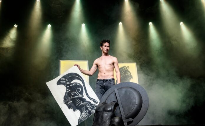 Ο Μιχάλης Σαράντης ερμηνεύει συγκλονιστικά και τους εννιά ρόλους της τραγωδίας, ενώ ο Απόστολος Χαντζαράς συνομιλεί μαζί του ζωγραφίζοντας, μπροστά στα μάτια των θεατών.