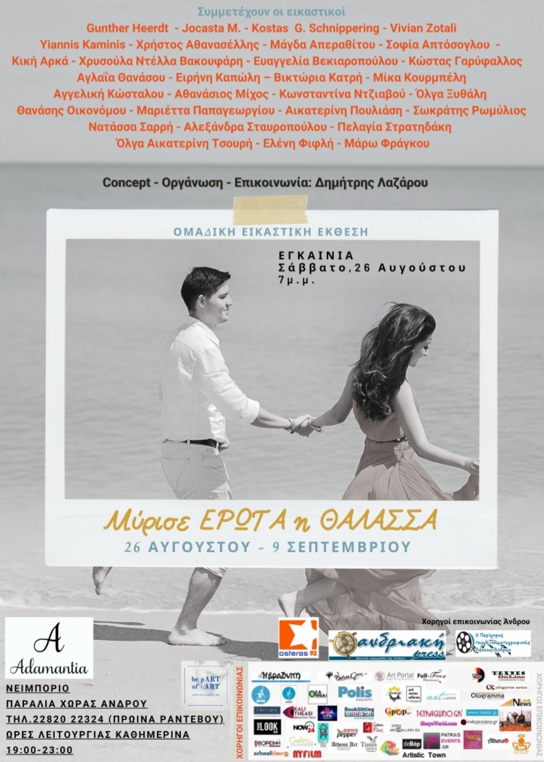 Ο χώρος Τέχνης Αδαμαντία – Adamantia Art Space (Νειμποριό – Άνδρος) παρουσιάζει από Σάββατο, 26 Αυγούστου έως Σάββατο, 9 Σεπτεμβρίου την Ομαδική Εικαστική Έκθεση Μύρισε ΕΡΩΤΑ η ΘΑΛΑΣΣΑ