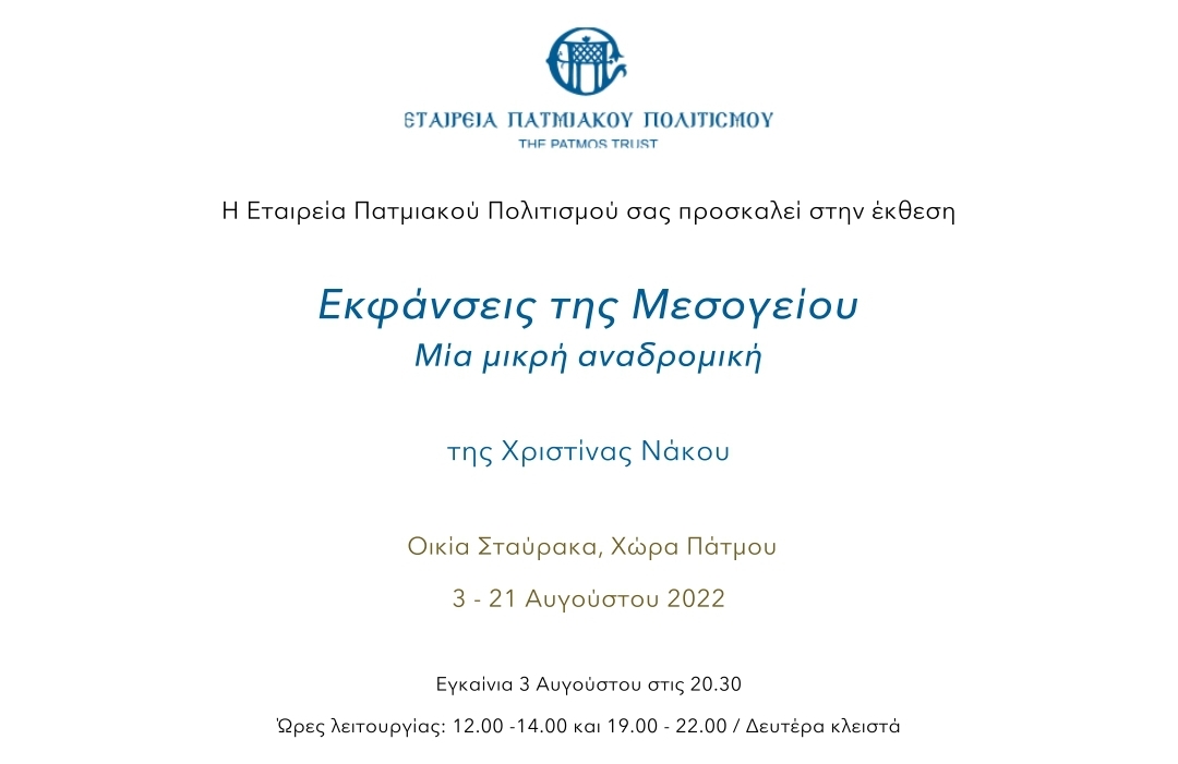 Η Εταιρεία Πατμιακού Πολιτισμού παρουσιάζει την έκθεση της Χριστίνας Νάκου Εκφάνσεις της Μεσογείου στον εκθεσιακό χώρο της Οικίας Σταύρακα, από τις 3-21 Αυγούστου.