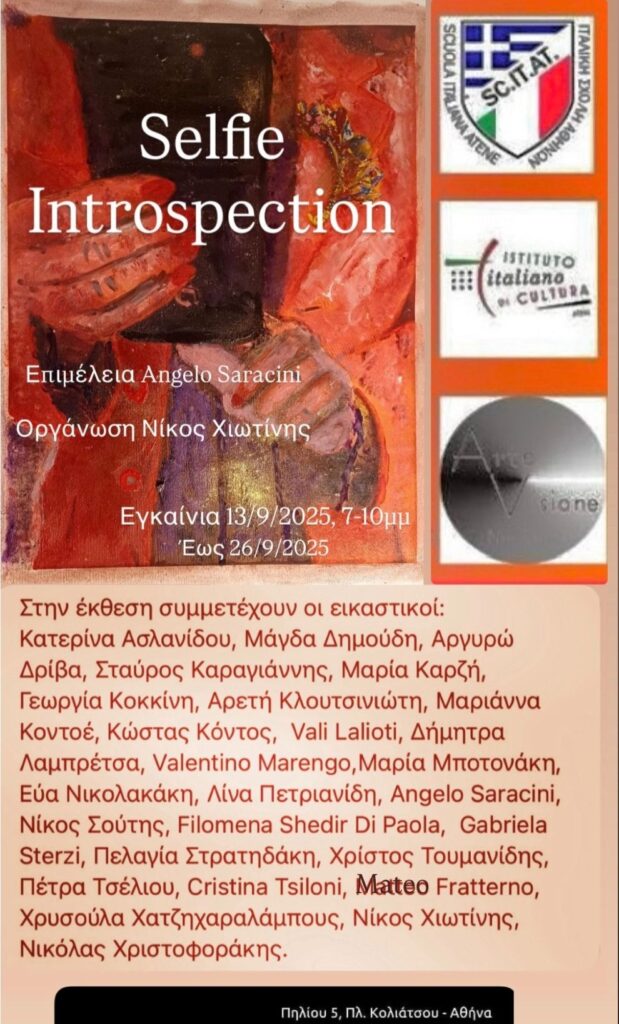 Con grande entusiasmo annunciamo l’imminente mostra collettiva dal titolo SELFIE/INTROSPEZIONE con il prestigioso patrocinio dell’Istituto Italiano di Cultura di Atene e della Scuola Italiana di Atene,un evento che promette di stimolare riflessioni profonde sull’autorappresentazione e la ricerca interiore.