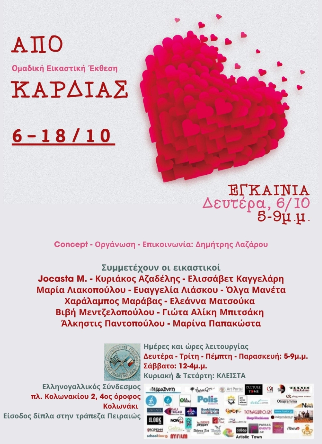 Στην καρδιά της Αθήνας, στο Κολωνάκι, στον ιστορικό χώρο του Ελληνογαλλικού Συνδέσμου, η Τέχνη συναντά τις καρδιές 12 εκλεκτών δημιουργών, εμπνέει και παρουσιάζει έργα ΑΠΟ ΚΑΡΔΙΑΣ, όπως άλλωστε είναι ο τίτλος της ομαδικής έκθεσης, που εγκαινιάζεται τη Δευτέρα, 6 Οκτωβρίου και ώρα 5-9μ.μ.