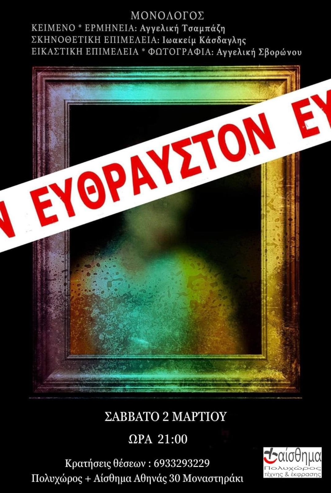Όσο παίζει το μικρασιάτικο τραγούδι «Θαλασσάκι μου» , το σκοτάδι έχει βυθίσει την σκηνή και η Αγγελική Τσαμπάζη ετοιμάζεται για τον μονόλογο της. Tο «Εύθραυστον» είναι ανθρώπινο, φωτίζει τις σχέσεις, τις καθημερινές μάχες με τον εαυτό μας, και ξεδιπλώνει τη μεταβαλλόμενη αυτοβιογραφική πραγματικότητα με έναν ιδιαίτερο τρόπο που σίγουρα δεν έχουμε συνηθίσει στη θεατρική σκηνή. Γύρω από ένα κρεβάτι που φιλοξενεί μόνο τα απαραίτητα, με απόλυτη ειλικρίνεια και χιούμορ παρουσιάζει τους αγώνες δύο γυναικών τόσο διαφορετικών αλλά και τόσο όμοιων.