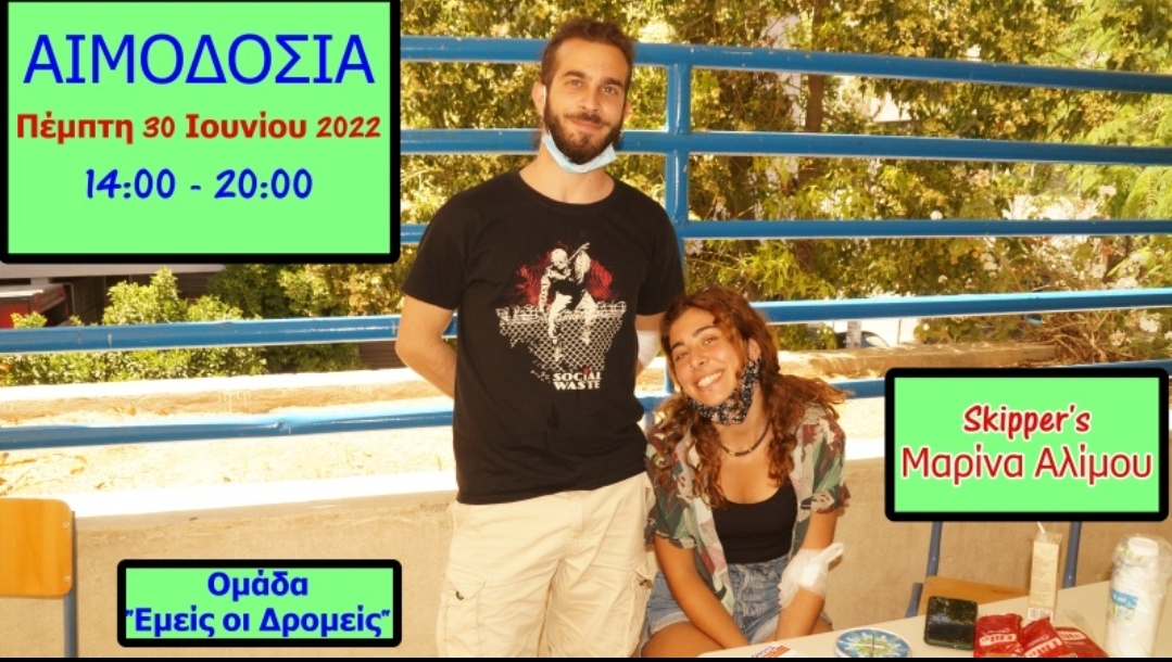 Η αιμοδοσία θα γίνει Πέμπτη 30 Ιουνίου 2022 από τις 14:00 ως τις 20:00 στο Skippers, το γνωστό bar στη Μαρίνα Αλίμου.
