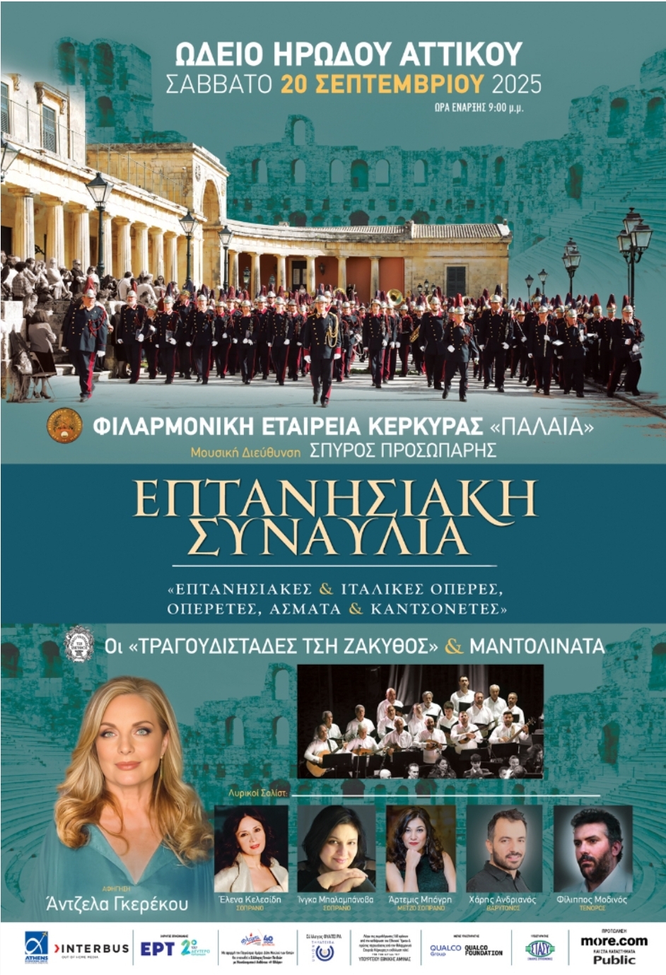 Μια μοναδική μουσική παράσταση θα έχει την ευκαιρία να παρακολουθήσει το κοινό, η οποία θα φέρει το άρωμα των Ιονίων νήσων στο κέντρο της Αθήνας. Για πρώτη φορά θα εμφανισθεί στο Ηρώδειο το Σάββατο 20 Σεπτεμβρίου η «Παλαιά Φιλαρμονική Κερκύρας», ως είθισται να λέγεται η «Φιλαρμονική Εταιρεία Κερκύρας», η οποία είναι ένας από τους πλέον ιστορικούς, μορφωτικούς και πολιτιστικούς φορείς της χώρας με συνεχή πορεία 185 ετών, καθώς ιδρύθηκε το 1840, για να μας ταξιδέψει στον χρόνο και να μας μεταφέρει στα καντούνια της Κέρκυρας. Συμμετέχουν σπουδαίοι σολίστ, οι περίφημοι «Τραγουδιστάδες τση Ζάκυθος», ενώ εμφάνιση έκπληξη της βραδιάς είναι η Άντζελα Γκερέκου.