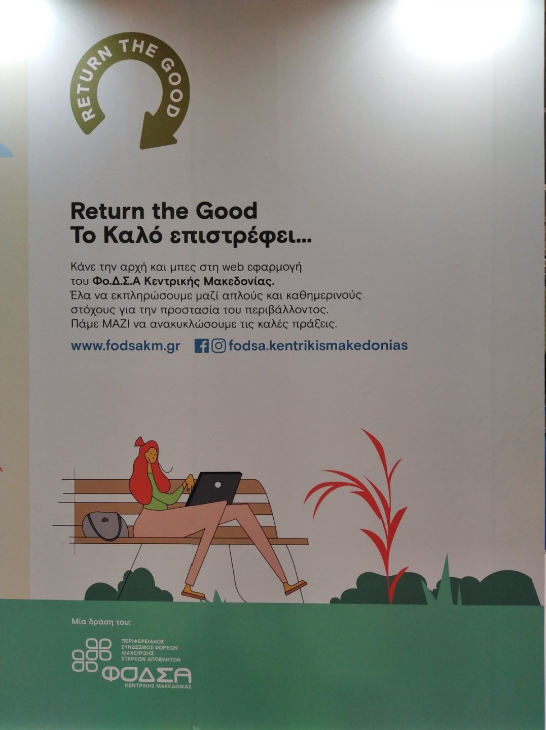Σε αυτό το πλαίσιο συμμετείχαμε ενεργά ως ΦΟΔΣΑ Κεντρικής Μακεδονίας παρουσιάζοντας την δική μας ψηφιακή εξέλιξη στην ψηφιακή εκπαίδευση – ευαισθητοποίηση των πολιτών μέσω έξυπνων εργαλείων και εφαρμογών. Πιο συγκεκριμένα, θεματική του περιπτέρου μας ήταν η εφαρμογή “Return the Good – Κάνε το καλό” που προσκάλεσε τους πολίτες να γίνουν πρεσβευτές καλής θελήσεως και να “ανακυκλώσουν το καλό” μέσω μιας δωρεάν, ηλεκτρονικής εφαρμογής στο http://returnthegood.fodsakm.gr, στην οποία γίνεται η καταγραφή καλών πράξεων.
