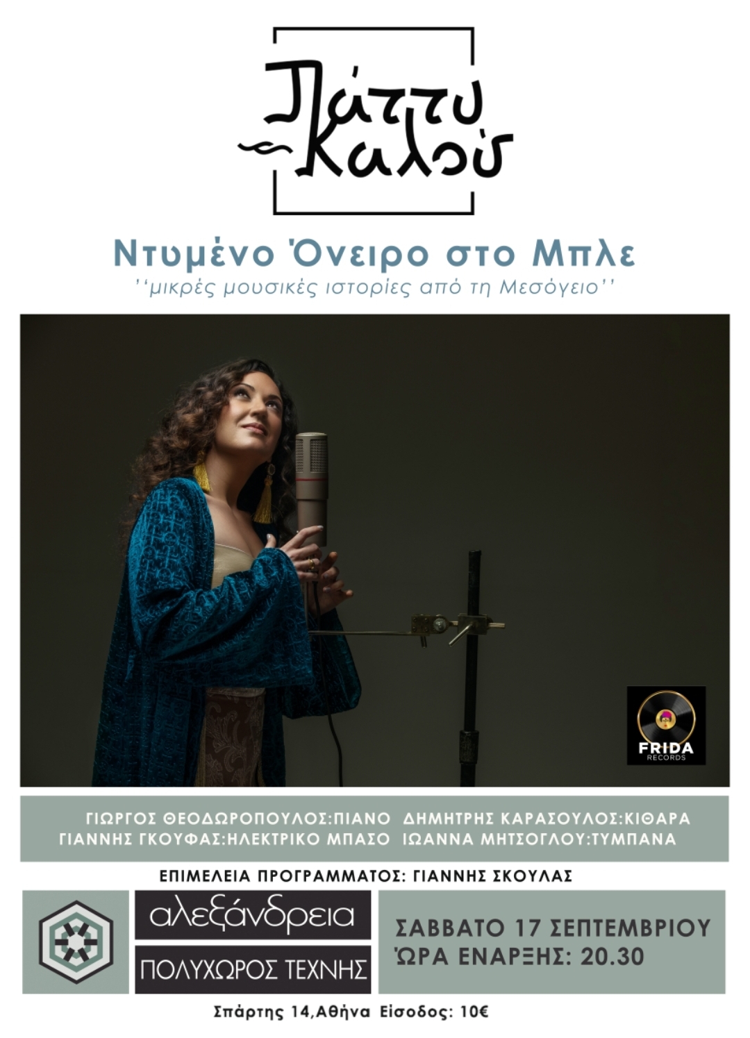 H Λευκαδίτισσα Πάττυ Καλού παρουσιάζει το Σάββατο 17 Σεπτεμβρίου στον Πολυχώρο Τέχνης “Αλεξάνδρεια” τη μουσική παράσταση με τίτλο: “Ντυμένο Όνειρο στο Μπλε.”