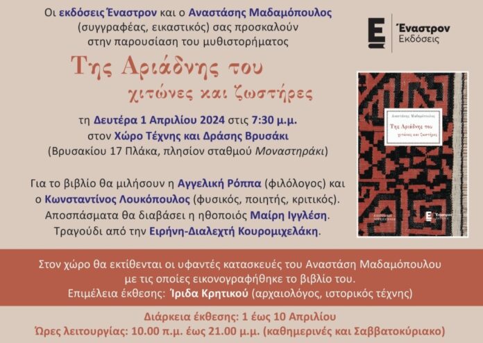 Η Αριάδνη της Ανάστασης -και του Αναστάση μου-, αποτελεί μια νέα σπαρταριστή ανάγνωση, επαν-εγγραφή και απτική μέσω της ύφανσής της ερμηνευτική του προ-ολύμπιου μύθου. Φιλοπερίεργη και φιλοθέαμη, φιλότεχνη και φιλοτάξιδη, η Αριάδνη εγκαταλείπει δίχως σκέψη τον κύκλιο εκστατικό χορό της στο γενέθλιο χοροστάσι του Δαιδάλου και το πατρικό παλάτι της Κνωσού, για να υφανο-φτερουγίσει ελεύθερη και αδέσμευτη στο εξής, στα πέρατα του νόστου. Για να εισχωρήσει στην καρδιά των απαγορευμένων, των δυσπρόσιτων, των κλειδωμένων γνώσεων. Για να χαράξει νέες πόλεις, σχέσεις, σχέδια, γέφυρες, βουνά, ποτάμια, μονοπάτια, ανθίβολα σε εδάφη άσπιλα. Για να τρυγήσει τη σιωπή. Για να εγγράψει τη γραφή. Για να συλλέξει υφάνσεις έως εσχάτων. Για να ερωτευτεί ξανά από την αρχή χωρίς να παντρευτεί. Χωρίς να ανήκει. Χωρίς να ανήκει καν στον Αναστάση –της, που την ακολουθεί εξακολουθητικά, υφαίνοντας ετούτο το ταξίδι.
