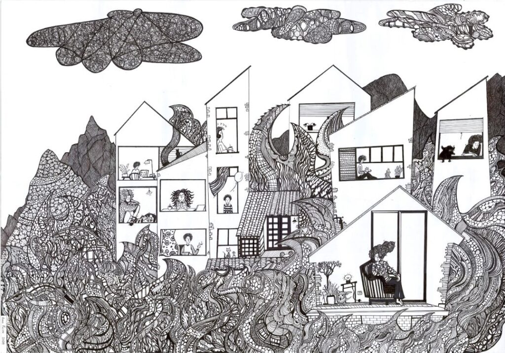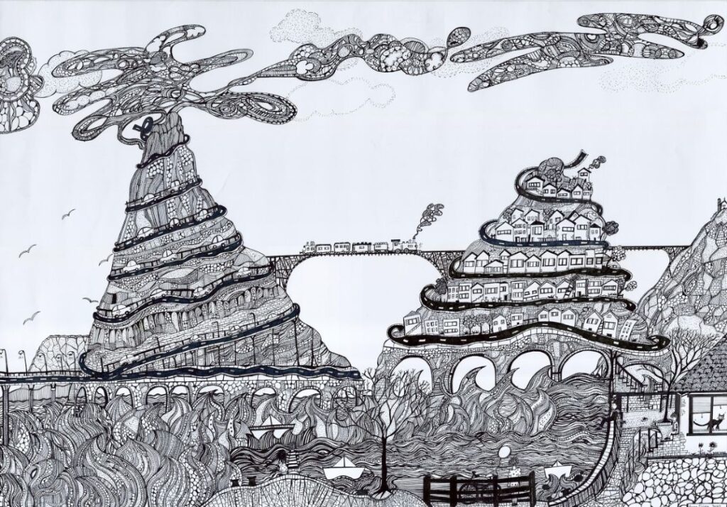Σημειώνει μεταξύ άλλων ο Επιμελητής κ. Πάρης Καπράλος στο κείμενο τεκμηρίωσης της έκθεσης: “…..ο σουρρεαλιστικός τίτλος της έκθεσης υπονοεί την ύπαρξη ενός επιπέδου, ή καλύτερα μιας ψυχικής συνθήκης, που δεν είναι προσβάσιμη μέσω των γνώριμων και αυτοματοποιημένων μηχανισμών της καθημερινότητας. Δεν ανεβαίνει, αλλά βυθίζεται. Δεν ανήκει στον χώρο της εξωτερικής πραγματικότητας, αλλά στον χώρο της εσωτερικής συνθήκης. Είναι η περιοχή εκείνη που η σύγχρονη ζωή, με τους ρυθμούς, τις δομές και τις επιταγές της, έχει αφήσει έξω από το οπτικό της πεδίο – και που τα έργα της Άννας Γκιώτη ανασύρουν με συνέπεια και εμμονή. Τα έργα της συνθέτουν ένα ιδιότυπο σύμπαν, όπου η γραμμή γίνεται το βασικό εργαλείο έκφρασης. Μέσα από την επίμονη χρήση του μελανιού και την τεχνική του line drawing, η εικαστικός χτίζει κόσμους περίκλειστους, ψυχικούς, με έντονη εσωτερικότητα και ρυθμική, σχεδόν υπνωτική δομή. Η επανάληψη, η λεπτομέρεια και η διαρκής ροή μοτίβων και συμβόλων αναδεικνύουν μια ιδιαίτερη μορφή ψυχογεωγραφίας, όπου το αστικό τοπίο μετατρέπεται ή επαναδιατυπώνεται σε ψυχική διάσταση. […] Η εικαστική γλώσσα της Άννας Γκιώτη παραπέμπει στην ελευθερία του αυτοματισμού, ενίοτε φλερτάροντας με τη λογική της doodle art ή του zentangle, χωρίς όμως να εξαντλείται εκεί. Η ίδια η επανάληψη των μοτίβων υποδεικνύει μια έντονη ψυχική ενασχόληση με τη λεπτομέρεια και τη φόρμα, σαν να αποτελούν κάθε φορά μια νέα απόπειρα χαρτογράφησης του εσωτερικού κόσμου.