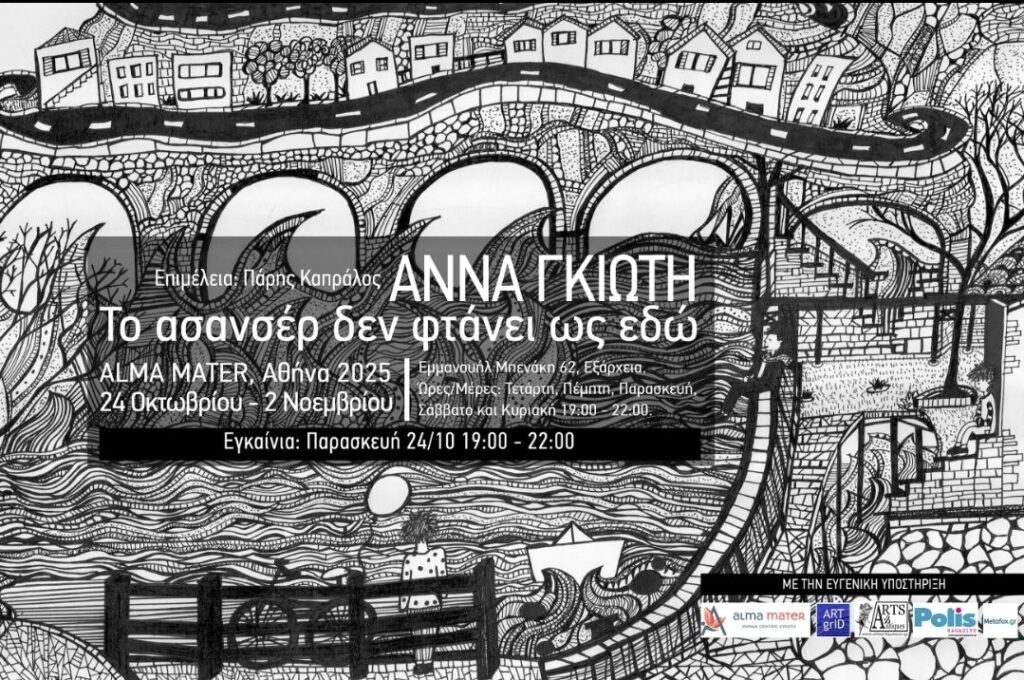 Ο χώρος τέχνης Alma Mater (Εμμανουήλ Μπενάκη 62, Εξάρχεια, Αθήνα), σε συνεργασία με τον Επιμελητή Τέχνης Πάρη Καπράλο, και τη πλατφόρμα για τη προώθηση των εικαστικών τεχνών ARTgrID, παρουσιάζει την ατομική έκθεση ζωγραφικής της εικαστικού Άννας Γκιώτη με τίτλο “Το ασανσέρ δεν φτάνει ως εδώ” στην Αθήνα, και προσκαλεί το φιλότεχνο κοινό στα εγκαίνια της τη Παρασκευή 24 Οκτωβρίου στις 19:00.