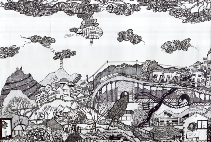 Σημειώνει μεταξύ άλλων ο Επιμελητής κ. Πάρης Καπράλος στο κείμενο τεκμηρίωσης της έκθεσης: “…..ο σουρρεαλιστικός τίτλος της έκθεσης υπονοεί την ύπαρξη ενός επιπέδου, ή καλύτερα μιας ψυχικής συνθήκης, που δεν είναι προσβάσιμη μέσω των γνώριμων και αυτοματοποιημένων μηχανισμών της καθημερινότητας. Δεν ανεβαίνει, αλλά βυθίζεται. Δεν ανήκει στον χώρο της εξωτερικής πραγματικότητας, αλλά στον χώρο της εσωτερικής συνθήκης. Είναι η περιοχή εκείνη που η σύγχρονη ζωή, με τους ρυθμούς, τις δομές και τις επιταγές της, έχει αφήσει έξω από το οπτικό της πεδίο – και που τα έργα της Άννας Γκιώτη ανασύρουν με συνέπεια και εμμονή. Τα έργα της συνθέτουν ένα ιδιότυπο σύμπαν, όπου η γραμμή γίνεται το βασικό εργαλείο έκφρασης. Μέσα από την επίμονη χρήση του μελανιού και την τεχνική του line drawing, η εικαστικός χτίζει κόσμους περίκλειστους, ψυχικούς, με έντονη εσωτερικότητα και ρυθμική, σχεδόν υπνωτική δομή. Η επανάληψη, η λεπτομέρεια και η διαρκής ροή μοτίβων και συμβόλων αναδεικνύουν μια ιδιαίτερη μορφή ψυχογεωγραφίας, όπου το αστικό τοπίο μετατρέπεται ή επαναδιατυπώνεται σε ψυχική διάσταση. […] Η εικαστική γλώσσα της Άννας Γκιώτη παραπέμπει στην ελευθερία του αυτοματισμού, ενίοτε φλερτάροντας με τη λογική της doodle art ή του zentangle, χωρίς όμως να εξαντλείται εκεί. Η ίδια η επανάληψη των μοτίβων υποδεικνύει μια έντονη ψυχική ενασχόληση με τη λεπτομέρεια και τη φόρμα, σαν να αποτελούν κάθε φορά μια νέα απόπειρα χαρτογράφησης του εσωτερικού κόσμου.