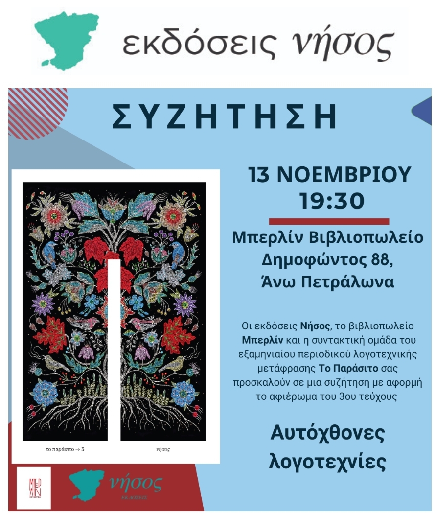 Οι εκδόσεις Νήσος, το Βιβλιοπωλείο Μπερλίν και η συντακτική ομάδα του εξαμηνιαίου περιοδικού λογοτεχνικής μετάφρασης Το Παράσιτο