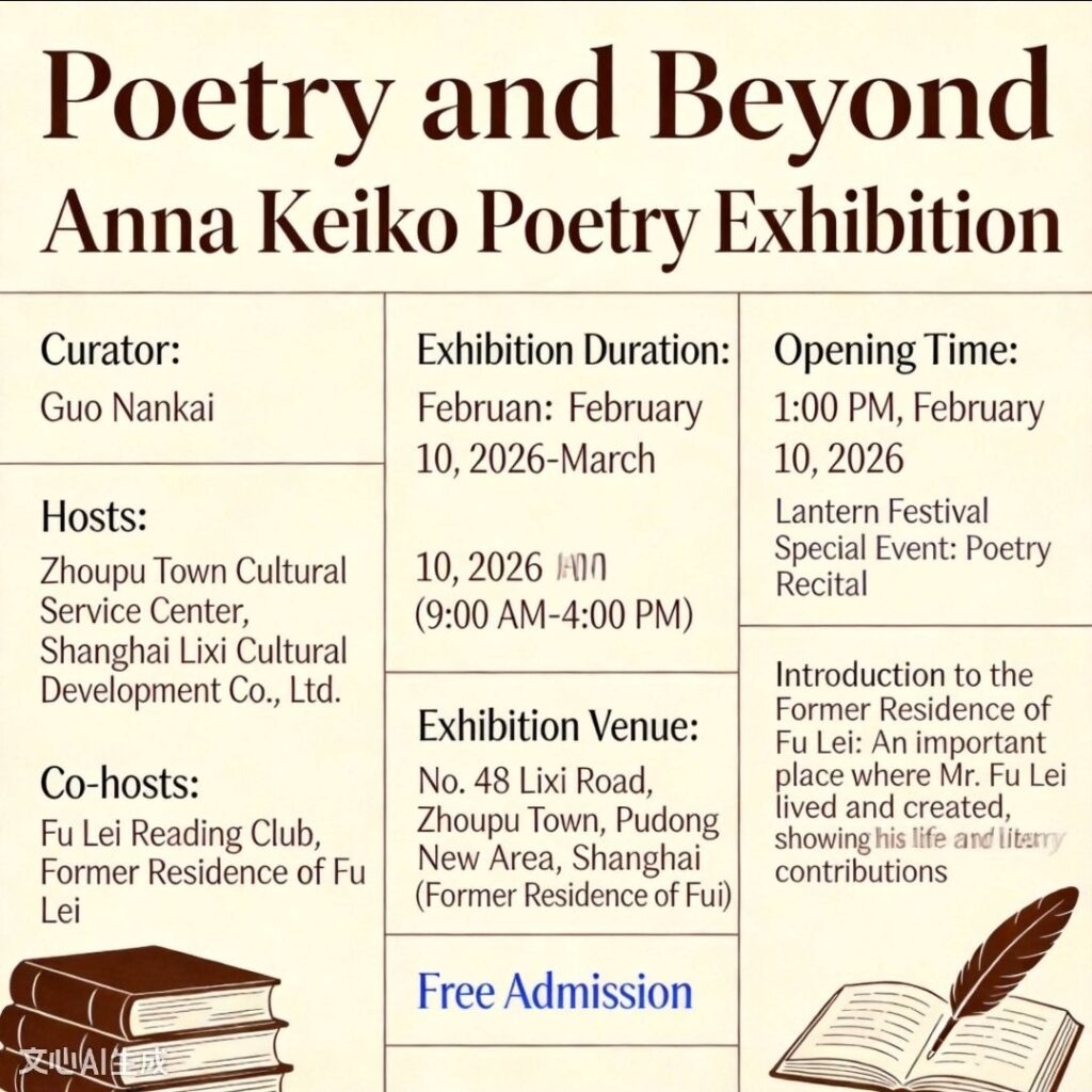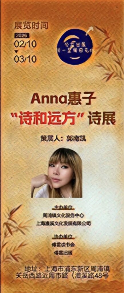 We are delighted to invite you to the “Poetry and Beyond” Poetry Exhibition & Recital by Anna Huizi, held at the Fu Lei Former Residence from February 10 to March 10, 2026.