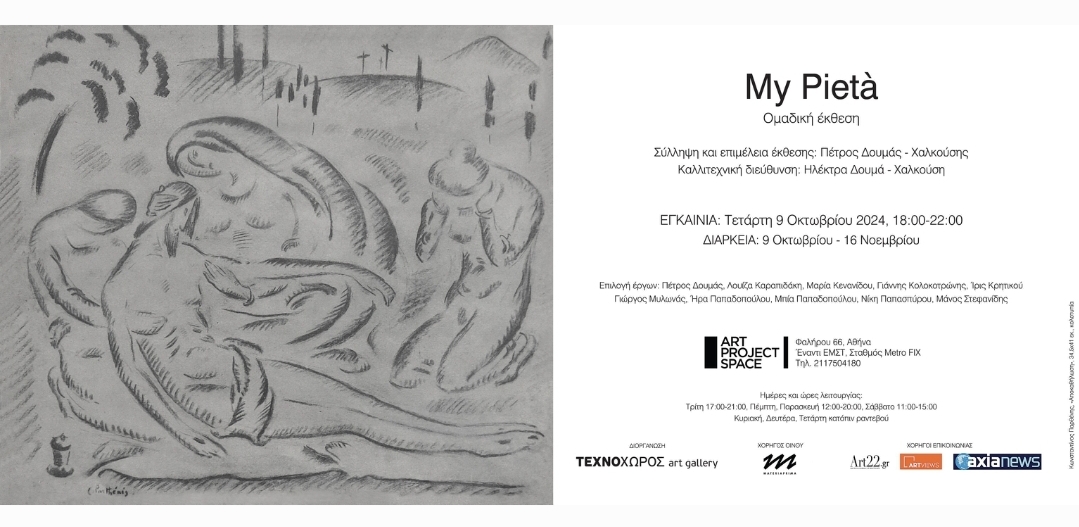 Η αίθουσα τέχνης Τεχνοχώρος παρουσιάζει στον χώρο του Art Project Space την ομαδική έκθεση με τίτλο My Pietà. Τα εγκαίνια της έκθεσης θα πραγματοποιηθούν την Τετάρτη 9 Οκτωβρίου στις 18:00, με διάρκεια έκθεσης έως 16 Νοεμβρίου 2024.