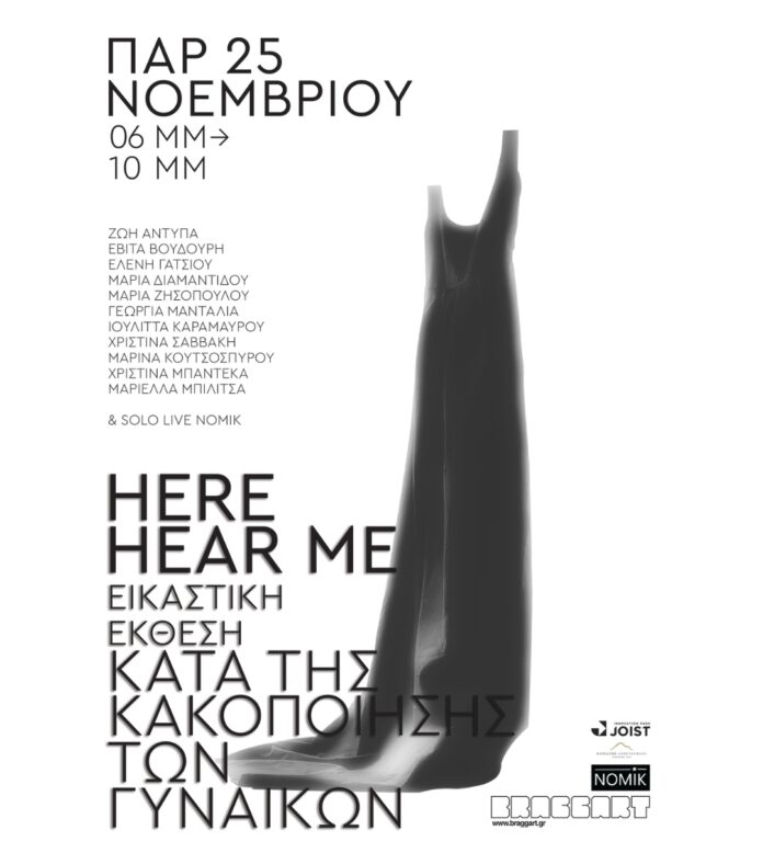 Η γκαλερί σύγχρονης τέχνης BRAGGART παρουσιάζει Εικαστική Εγκατάσταση στο Πάρκο καινοτομίας JOIST στη Λάρισα, στης 25 Νοεμβρίου 2022,18:00 – 22:00, Διεθνής Ημέρα για την Εξάλειψη της Βίας κατά των Γυναικών. Σας προσκαλούμε για να τιμήσουμε τις Γυναίκες, μητέρες, νέες, μεσήλικες, ηλικιωμένες, που δεν τις άκουσε κάνεις, είναι εδώ και με μια φωνή μαζί να ευαισθητοποιήσει όλους μας, μέσα από την Τέχνη να υψώσουμε τη φωνή και το σώμα μας, για  να σταματήσει εδώ η κακοποίηση των Γυναικών. HERE HEAR ME, ΕΔΩ ΑΚΟΥΣΕ ΜΕ