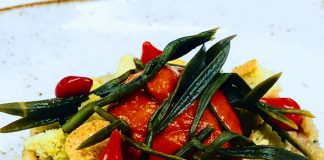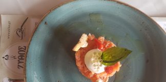 “Σολωμός ταρτάρ με μους λευκού ταραμά, πέρλες λεμονιού και δάκρυ πιπεριάς”