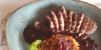 “Φιλέτο πάπιας με κρασάτη σάλτσα κόκκινων φρούτων, σε σταρώτο με κουκουνάρι...