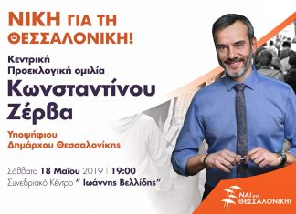 Το Σάββατο, 18 Μαΐου 2019, στις 19.00, στο συνεδριακό κέντρο Ιωάννης Βελλίδης, θα πραγματοποιηθεί η κεντρική προεκλογική ομιλία του υποψήφιου δημάρχου Θεσσαλονίκης, Κωνσταντίνου Ζέρβα....