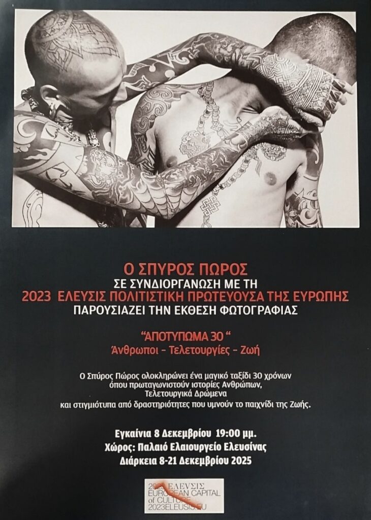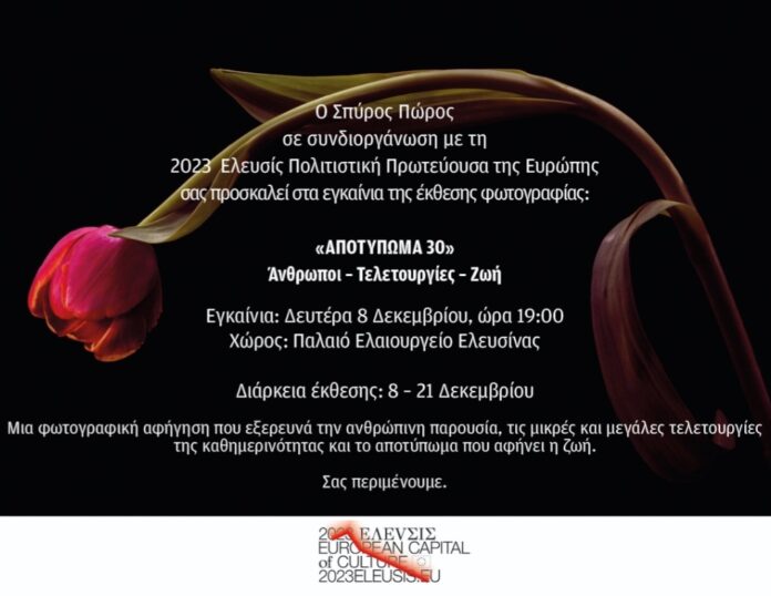 Μια ξεχωριστή εικαστική πρόταση υποδέχεται η Ελευσίνα τον Δεκέμβριο, καθώς ο διεθνούς φήμης και κύρους φωτογράφος Σπύρος Πώρος παρουσιάζει με την 2023 Έλευσις Πολιτιστική Πρωτεύουσα της Ευρώπης στο Παλαιό Ελαιουργείο την επετειακή του έκθεση “Αποτύπωμα 30” αφιερωμένη στα τριάντα χρόνια της καλλιτεχνικής του καριέρας.