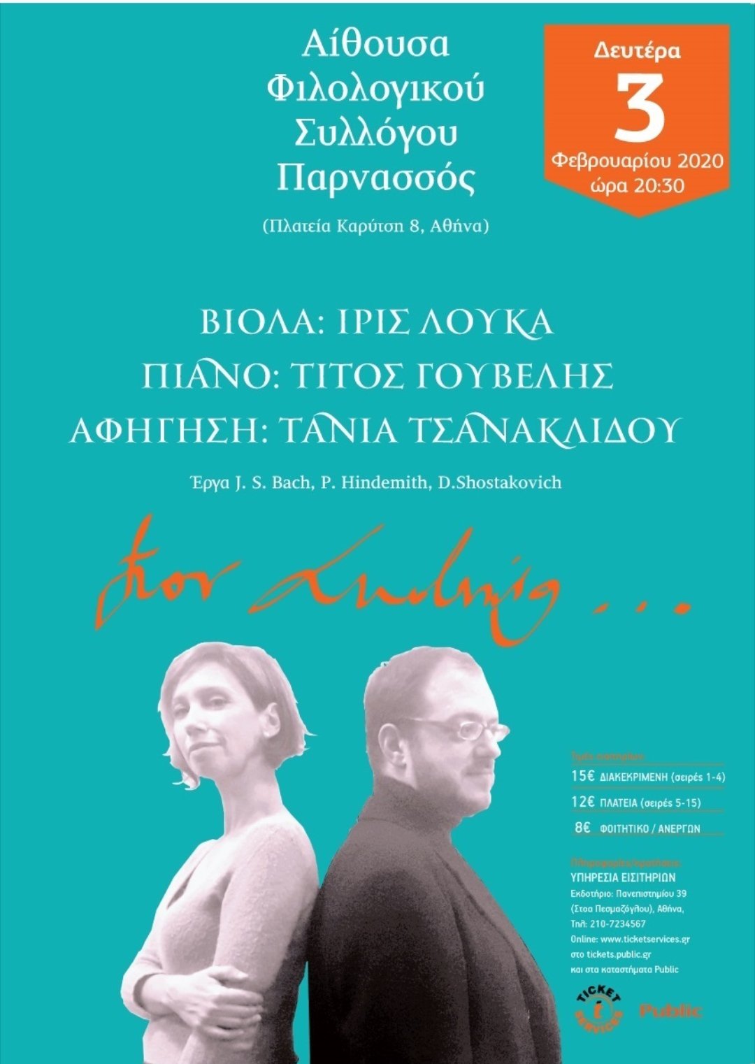 Δύο καταξιωμένοι μουσικοί, μέλη της Κρατικής Ορχήστρας Αθηνών, η βιολίστα και υποψήφια διδάκτωρ του Ιονίου Πανεπιστημίου Ίρις Λουκά και ο πιανίστας Τίτος Γουβέλης συμπράττουν σε μια μοναδική συναυλία σε έναν χώρο εξαιρετικής ακουστικής και αισθητικής, την ιστορική αίθουσα του Φιλολογικού Συλλόγου Παρνασσός.