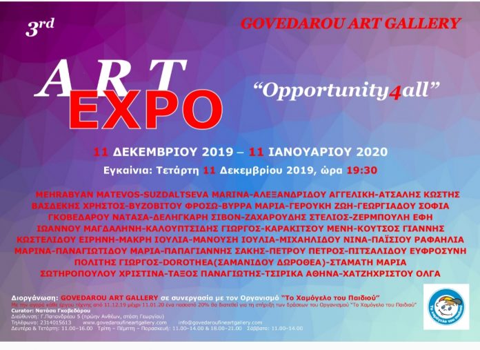 Τα εγκαίνια της έκθεσης θα γίνουν στο χώρο της γκαλερί Γ. Παπανδρέου 5 (πρώην Ανθέων-στάση Γεωργίου) την Τετάρτη 11 Δεκεμβρίου, ώρα 19:30. Η 3rd ArtExpo: “Opportunity4all” διοργανώνεται για τρίτη συνεχή χρονιά από την GOVEDAROU ART GALLERY με σκοπό κάθε χρόνο και την ενίσχυση κάποιου ιδρύματος ή φορέα με μέρος των εσόδων από τη πώληση έργων εικαστικών που συμμετέχουν.