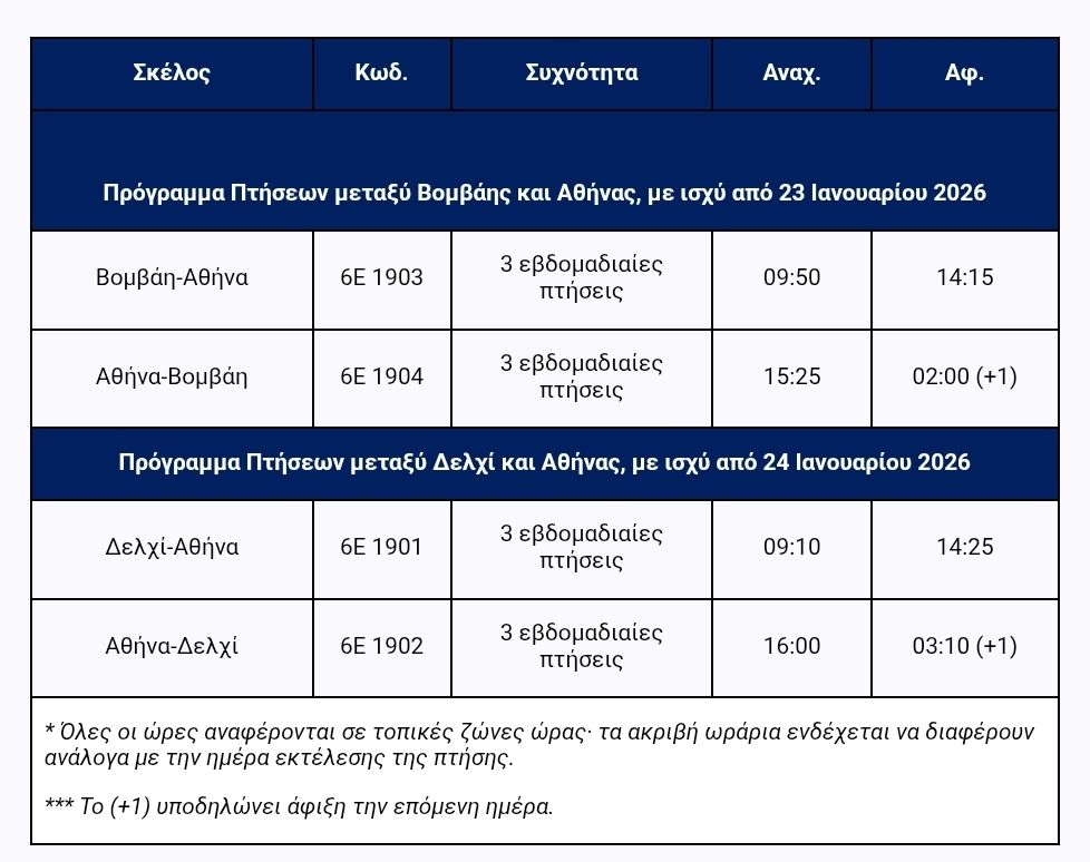 Η IndiGo, η προτιμώμενη αεροπορική εταιρεία της Ινδίας, εγκαινίασε σήμερα τις απευθείας πτήσεις μεταξύ Βομβάης και Αθήνας, σηματοδοτώντας το «ντεμπούτο» της σε πτήσεις μεγάλων αποστάσεων με αεροσκάφος στενής ατράκτου, με την αξιοποίηση του πρώτου στην Ινδία, Airbus A321XLR. Από αύριο, 24 Ιανουαρίου 2026, η IndiGo θα συνδέει την Αθήνα και με το Δελχί, με το ίδιο αεροσκάφος. Με αυτά τα δρομολόγια η IndiGo γίνεται ο πρώτος ινδικός αερομεταφορέας που θα επιχειρεί απευθείας στις δύο χώρες, καθώς θα εκτελεί τρεις πτήσεις την εβδομάδα σε κάθε προορισμό, ενώ σχεδιάζει να ενισχύσει περαιτέρω την ελληνική διασυνδεσιμότητα προσθέτοντας σταδιακά προορισμούς.