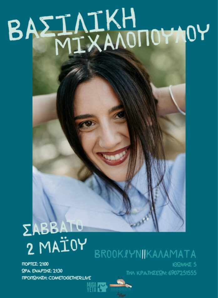 Η Βασιλική Μιχαλοπούλου μας προσκαλεί το Σάββατο 2 Μαΐου στην Καλαμάτα στο Brooklyn για ένα ξεχωριστό live με αγαπημένες επιτυχίες, δικές της και άλλων Ελλήνων καλλιτεχνών!