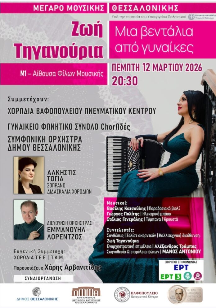 Η μουσικοσυνθέτις Ζωή Τηγανούρια, μαζί με το Βαφοπούλειο Πνευματικό Κέντρο, τον ΟΜΜΘ, τη Συμφωνική Ορχήστρα Δήμου Θεσσαλονίκης, το Σωματείο Φίλων του Βαφοπουλείου και τη σοπράνο Άλκηστις Τόγια, υπό τη διεύθυνση του μαέστρου Εμμανουήλ Λορέντζου, θα παρουσιάσουν μία συναυλία αφιερωμένη στη γυναίκα.