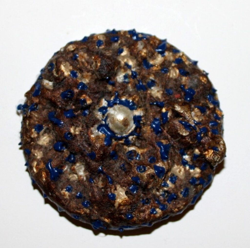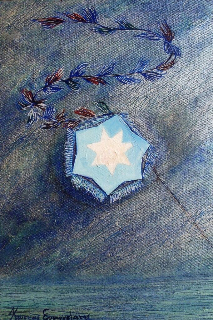 Ο Ευαγγελάτος εκτός από το Ημερολόγιο παρουσιάζει και μια ποικιλία από εικαστικές κονκάρδες με χρώμα, όπως η κόκκινη με ένα τυρκουάζ στο κέντρο της ή η μπλε με ένα τυρκουάζ ή με ένα κοχύλι ή ένα θραύσμα από σερβίτσιο… Μια ποικιλία όμορφη και ιδέα πρωτότυπη.