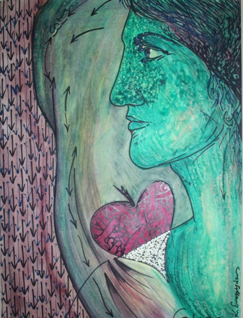 “Ο Ευαγγελάτος έχει φιλοτεχνήσει έργα με γυναικείες παρουσίες, με φωτεινά μαλλιά και τα μεγάλα μάτια, τη θλίψη ή τη γνώση των αιώνων στο βλέμμα το βαθύ, το σώμα με τα ζουμερά τα στήθη και τη γόνιμη κοιλιά, φιγούρες με ορατά τα αόρατα ιόντα, σχήματα που τείνουν να πάρουνε μορφή στη μήτρα της δημιουργίας κι ακόμα, στρόβιλοι και λαβύρινθοι, κύκλοι, κοχλίες, πρόσωπα σαν ξωτικά, άλλα σαν να κάηκαν από τον ήλιο, άλλα στη δίνη του νερού ή του ανέμου… φιγούρες που θα έλεγες πως στροβιλίζονται στην αέναη κίνηση των στοιχείων του σύμπαντος και μεταμορφώνονται από τον ένα πίνακα στον άλλο.