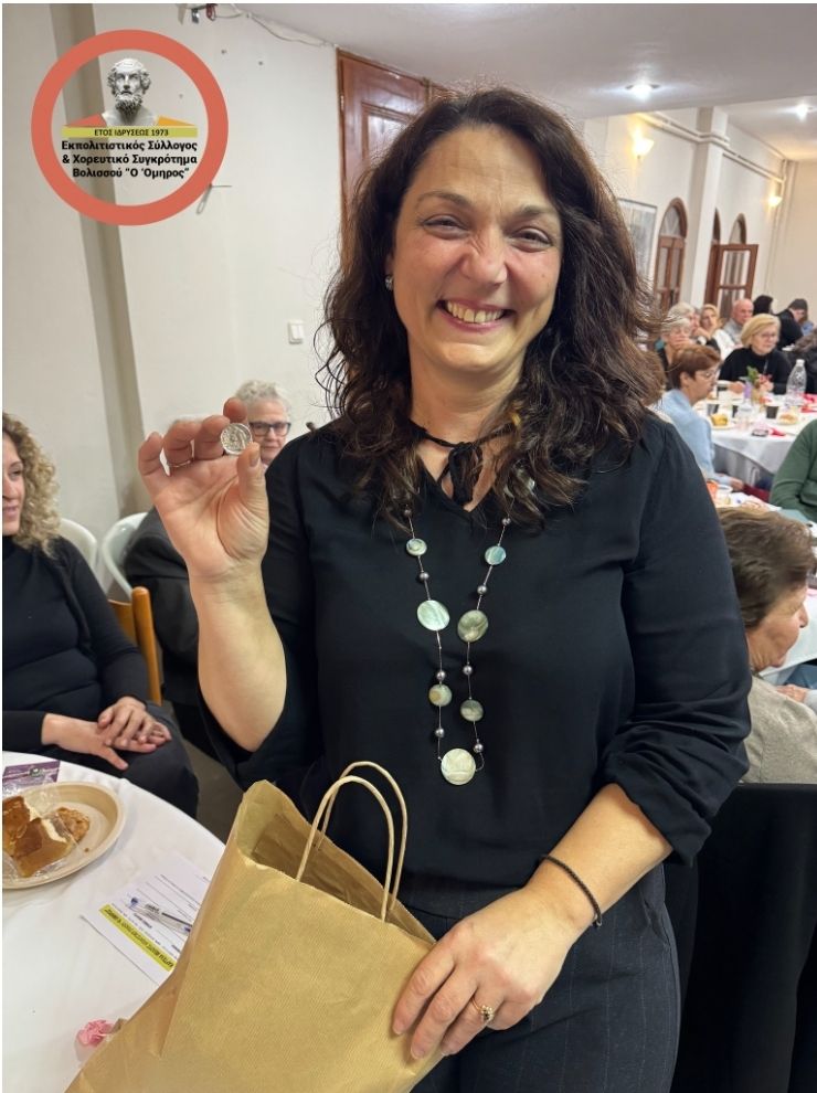 Ιδιαίτερη χαρά προκάλεσε και η ανάδειξη της δεύτερης τυχερής, της κας Χρυσούλας Τσιγκοπούλου, η οποία βρήκε το φλουρί της μεγάλης πίτας και παρέλαβε το γούρι του συλλόγου καθώς και ένα γεύμα στην ταβέρνα «Πεύκος» στα Διευχά, μέσα σε θερμά χειροκροτήματα και ευχές από όλους τους παρευρισκόμενους.