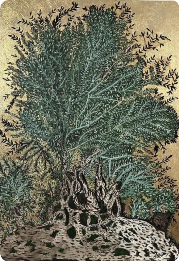 Η Ελιά ως δέντρο ειρήνης σοφίας κ αντοχής και η Ροδιά ως καρπός αφθονίας, ζωής αναγέννησης. Μέσα από τη χρήση του χρυσού ήθελα να αποδώσω έναν συμβολισμό ιερής λάμψης να συνδέσω το φως του βυζαντινού κόσμου με την διαχρονικότητα της φύσης και της ελληνικής φύσης.