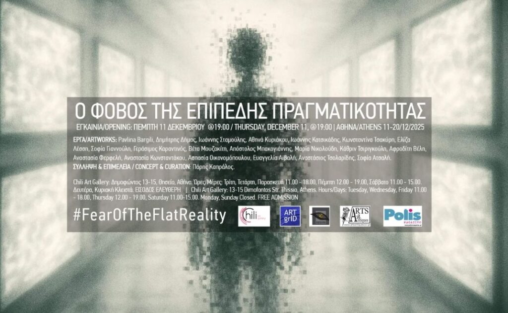 Ο επιμελητής τέχνης Πάρης Καπράλος σε συνεργασία με εικαστικούς καλλιτέχνες από την Ελλάδα και το εξωτερικό σας προσκαλούν να επισκεφθείτε την έκθεση “Ο Φόβος της Επίπεδης Πραγματικότητας” και να τιμήσετε με την παρουσία σας τα εγκαίνια της την Πέμπτη 11 Δεκεμβρίου 2025 ώρες 19:00 – 22:00.