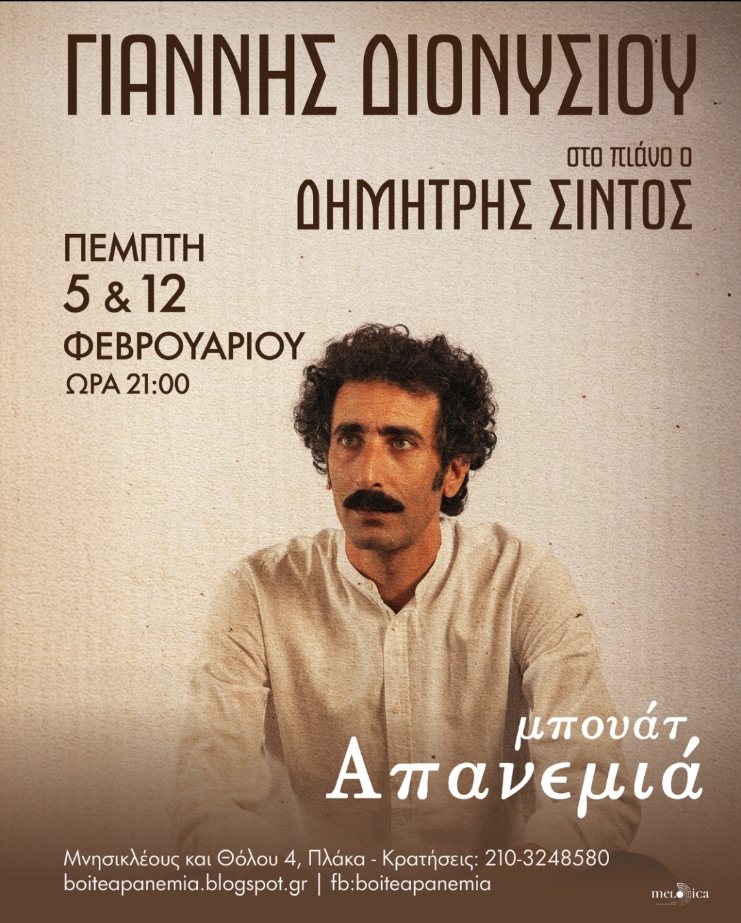 Ο Γιάννης Διονυσίου μας προσκαλεί στην Μπουάτ Απανεμιά την Πέμπτη 5 και 12 Φεβρουαρίου. Μαζί του στο πιάνο ο Δημήτρης Σίντος.
