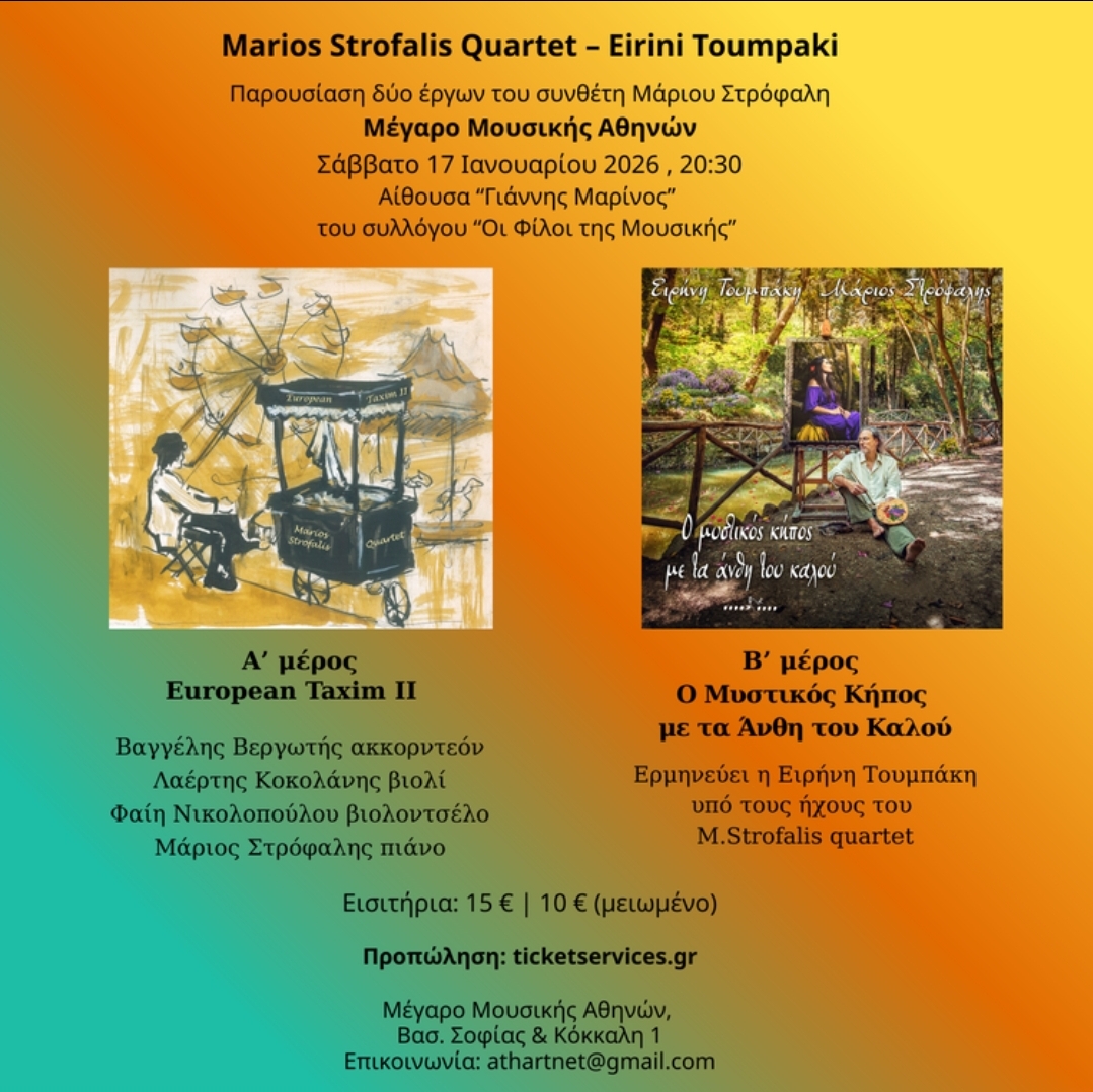 Ο Μάριος Στρόφαλης με το κουαρτέτο του και την Ειρήνη Τουμπάκη μας προσκαλούν το Σάββατο 17 Ιανουαρίου στο Μέγαρο Μουσικής Αθηνών στην αίθουσα “Γιάννης Μαρίνος” του συλλόγου “Οι Φίλοι της Μουσικής”! Η συναυλία τους αποτελείται από δύο μέρη. Στο πρώτο μέρος παρουσιάζουν τον κύκλο σύγχρονης μουσικής δωματίου με τίτλο «European Taxim II» ενώ στο δεύτερο μέρος τη συλλογή τραγουδιών με τίτλο «Ο μυστικός κήπος με τα άνθη του καλού».