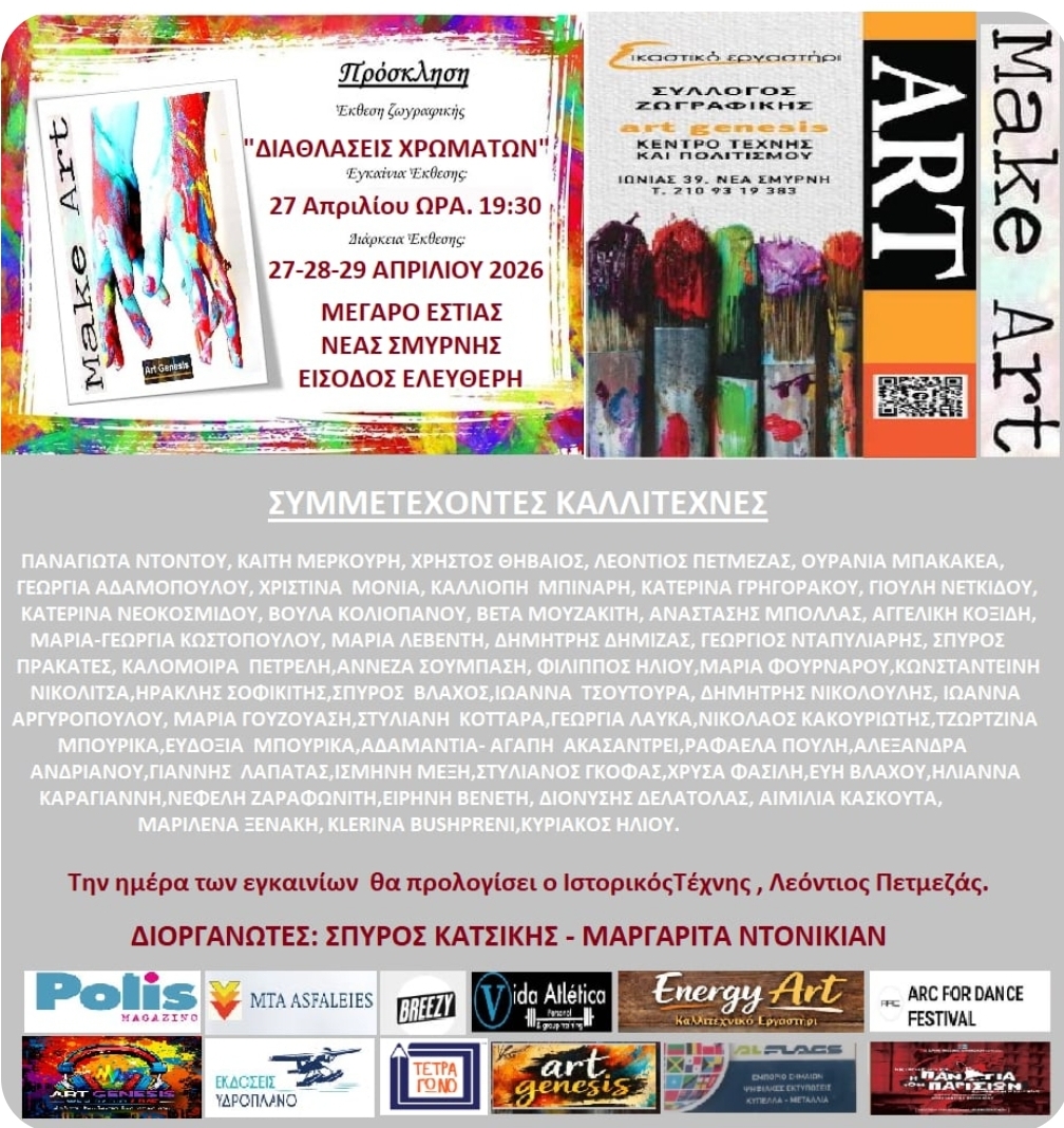 Η Εστία Νέας Σμύρνης φιλοξενεί την Art-Genesis, φορέα Τέχνης και Πολιτισμού της Νέας Σμύρνης με την ομαδική έκθεση ζωγραφικής, “ΔΙΑΘΛΑΣΕΙΣ ΧΡΩΜΑΤΩΝ”.