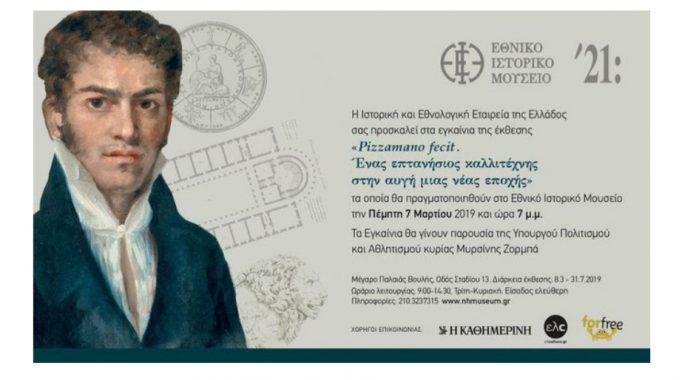Tην Πέμπτη 7 Μαρτίου, στις 7:00 μ.μ. εγκαινιάζεται στο Εθνικό Ιστορικό Μουσείο η έκθεση Pizzamano fecit. Ένας επτανήσιος καλλιτέχνης στην αυγή μιας νέας εποχής, παρουσία της Υπουργού Πολιτισμού και Αθλητισμού κυρίας Μυρσίνης Ζορμπά.