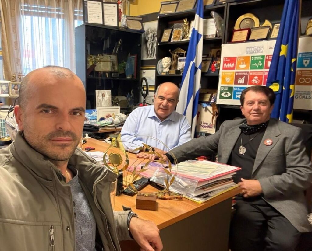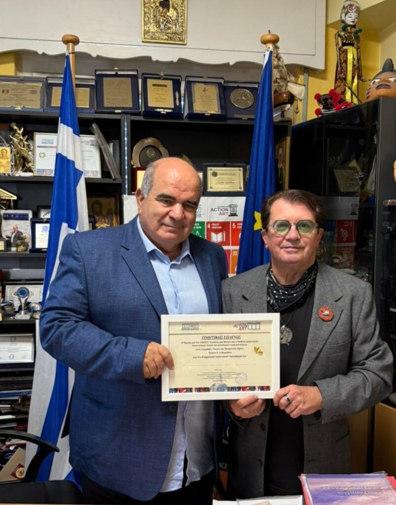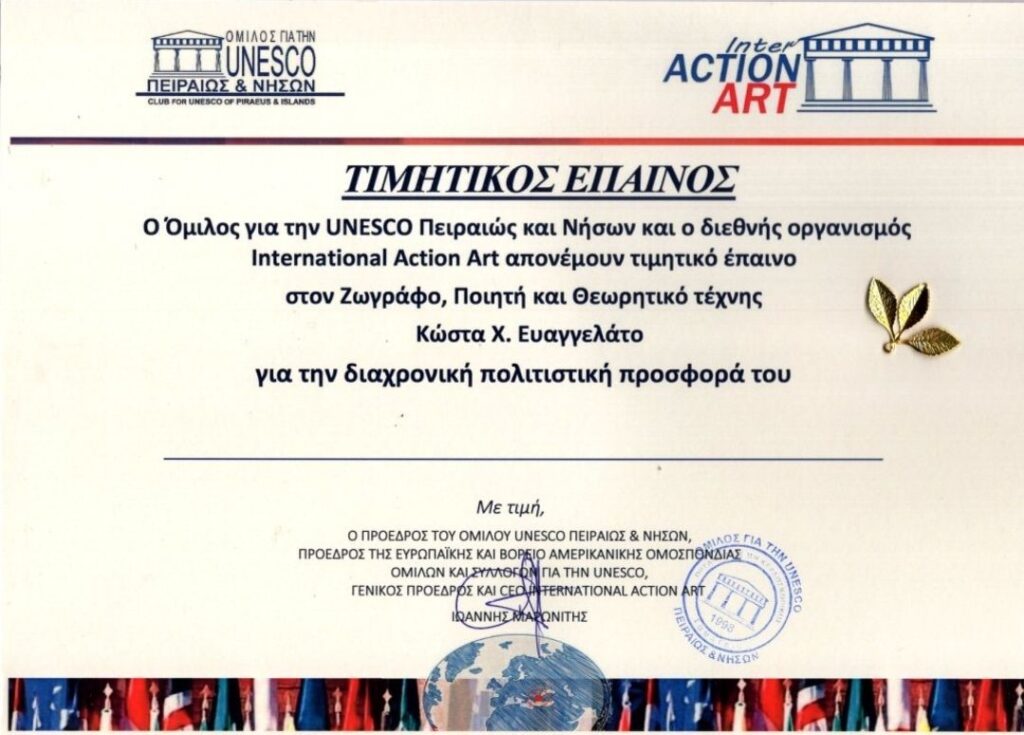 Παρέλαβε, την ημέρα των γενεθλίων του, τιμητικό έπαινο για το σύνολο της καλλιτεχνικής του προσφοράς από τον κ. Ιωάννη Μαρωνίτη, πρόεδρο των Ομίλων για την Unesco της Ευρώπης και της Βόρειας Αμερικής και πρόεδρο της International Action Art, του Ομίλου για την Unesco Πειραιώς και Νήσων.