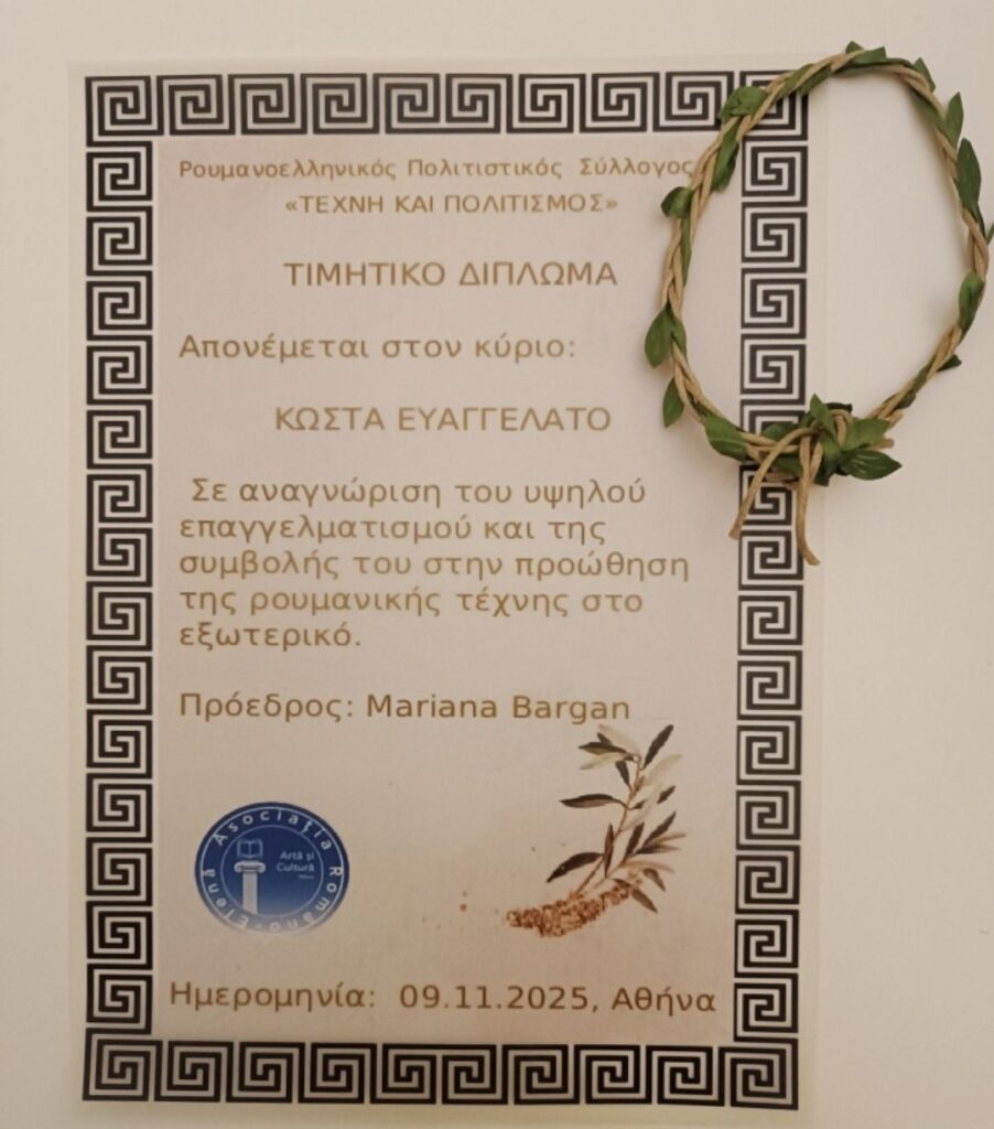 Του απονεμήθηκε επίσης τιμητικό δίπλωμα και συμβολικό στεφάνι ελιάς από την κ. Marianna Barkan, Πρόεδρο του Ρουμανοελληνικού Πολιτιστικού Συλλόγου «Τέχνη και Πολιτισμός», μετά την θεωρητική, κριτική του προσέγγιση στα εγκαίνια της έκθεσης του Ρουμάνου καλλιτέχνη Petre Grigorin , με τίτλο «Μεταμόρφωση».