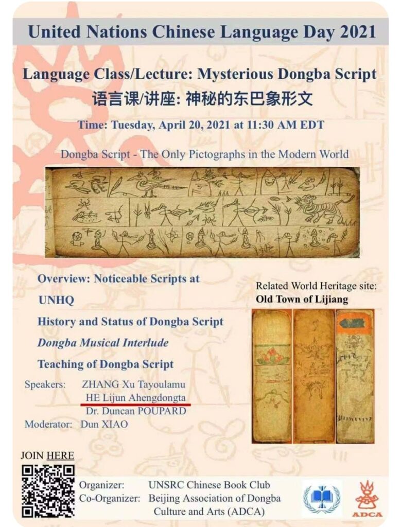 Five years ago during the 12th UN Chinese Language Day one of the three core thematic lectures selected by the United Nations “The Mysterious Dongba Hieroglyphs” was solemnly held at our Dongba Culture Academy